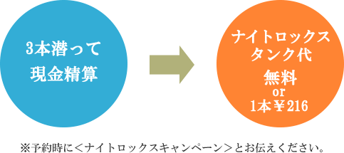 | ご利用条件とお願い | 1)予約時に<ナイトロックスキャンペーン利用>とお伝えください。 2)3本潜って現金精算されることが条件となります。 ※旅行会社を通された場合、現金精算されても対象とはなりません。 ※精算時に振り込みでも可能です。 3)ナイトロックスSPのカードを必ずご提示ください。 4)ナイトロックスSPをお持ちでないお客様は体験ナイトロックスの料金となります。※1本1,320円 5)タンクに限りがあるため、不足した場合は、申し込みの早いお客様を優先させて頂きます。 6)12Lタンクは差額が発生します。「¥1,430/本」となり、キャンペーン価格が1本¥715になります。予約時に申込みください。 7)他キャンペーンや割引券等との併用はできません。 8)タンクの状況により、無断でキャンペーンを終わらせて頂くこともありますので、ご了承ください。 |