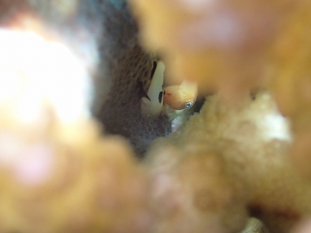 サンゴの隙間にいるアカテンコバンハゼ!