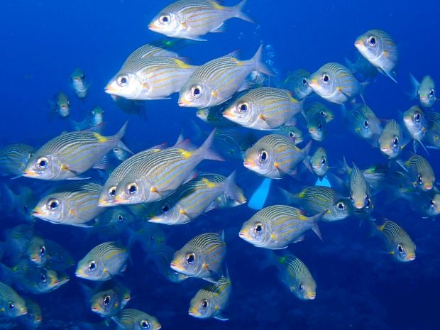 マンタを見に来てノコギリダイの群れを見るのは恒例行事。