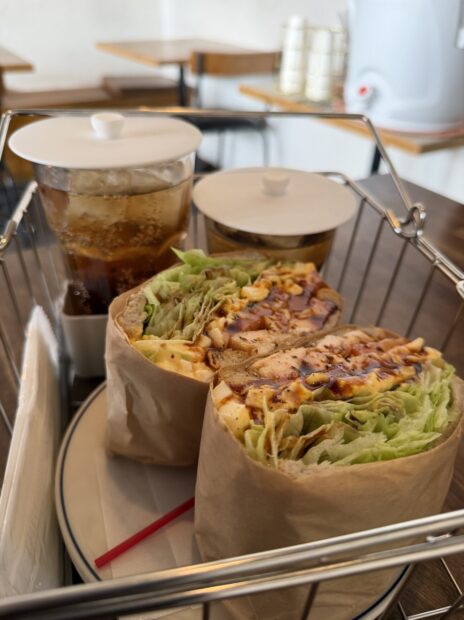 朝ごはんは盛り盛りのサンドイッチ。