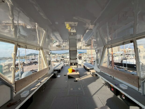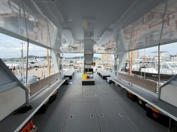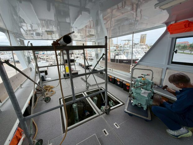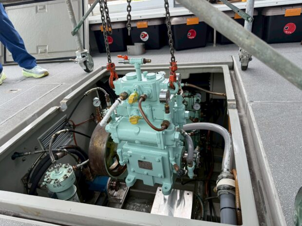 昨日船に乗せておいたコンプレッサーを定位置に戻していきます。