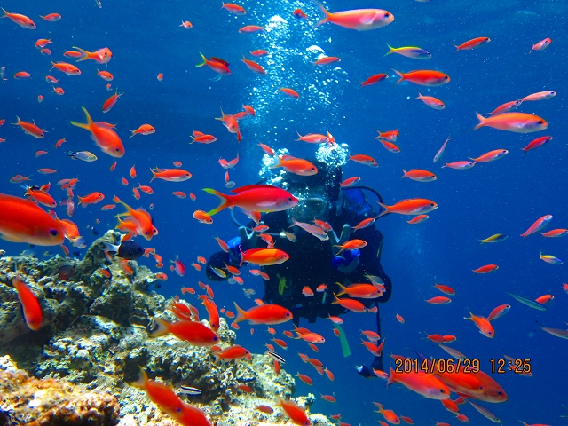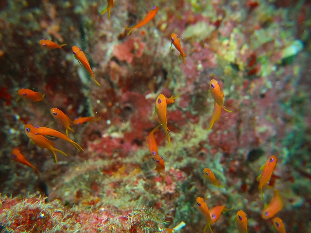 流れも弱く、赤いイソバナとオレンジのキンギョハナダイ達。