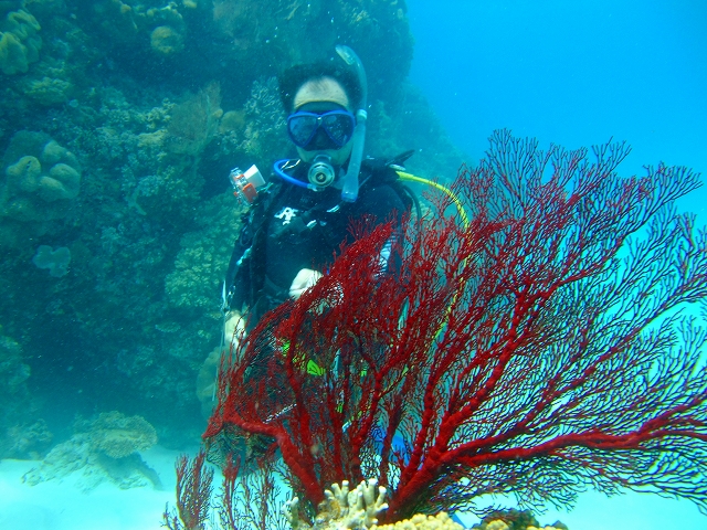 サンゴの上には色とりどりの魚が群れ、イソバナの前にはアカネハナゴイも群れいます。