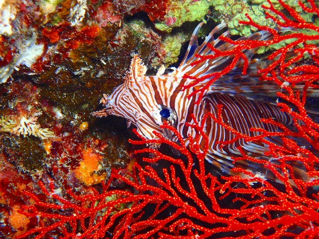 ロクセンスズメダイなどが、真っ赤なイソバナの近くで
