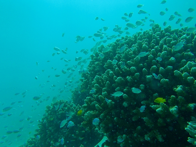 浜島東で色とりどりのサンゴと水色のデバスズメダイの群れに
