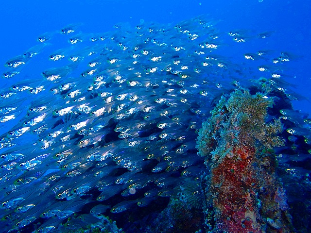 すると、大きな魚が何匹も見えるぞ!?・・・・・サバヒーです!十匹以上がグルクンの周りをウロウロしていました。普段、見る機会が少ない魚なのでとても嬉しいのですが、マンタはどこ!??