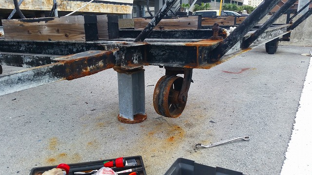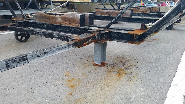 先日、船を降ろした時に壊れてしまったので、ジャッキで台車を持ち上げ