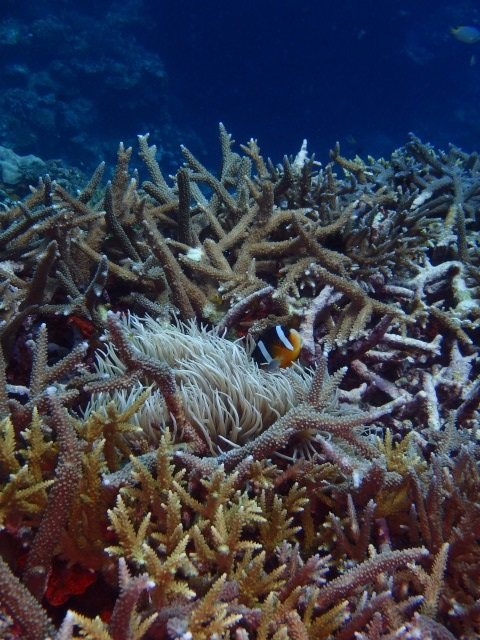 浅場はサンゴが群生しており、その上をスズメダイが浮遊しています。