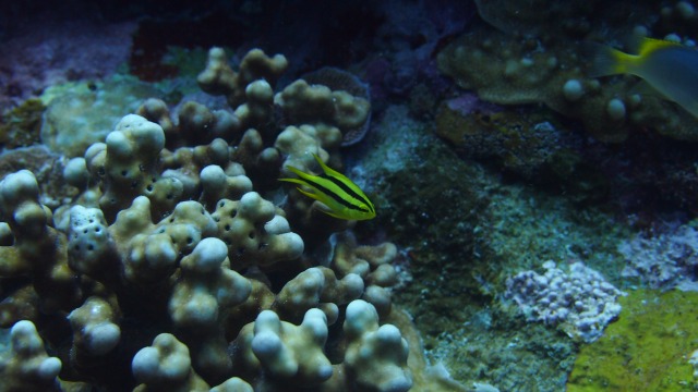 黄色と黒のシマがかっこいいヒレナスズメダイの幼魚☆