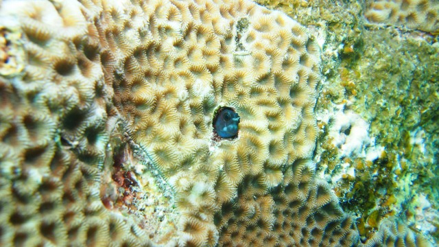 サンゴの穴から顔を出すのはフタイロカエルウオ☆