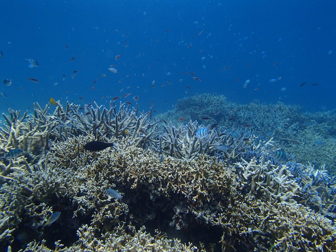 メインの根は小さな生物やソフトコーラルが多く、浅場は一面のサンゴ畑。