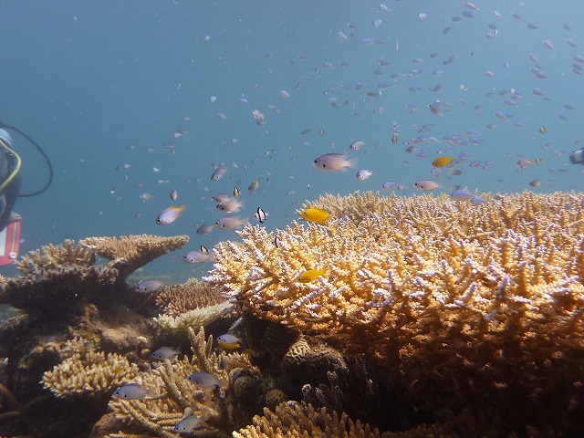 サンゴの周りには沢山のスズメダイが住んでいます☆
