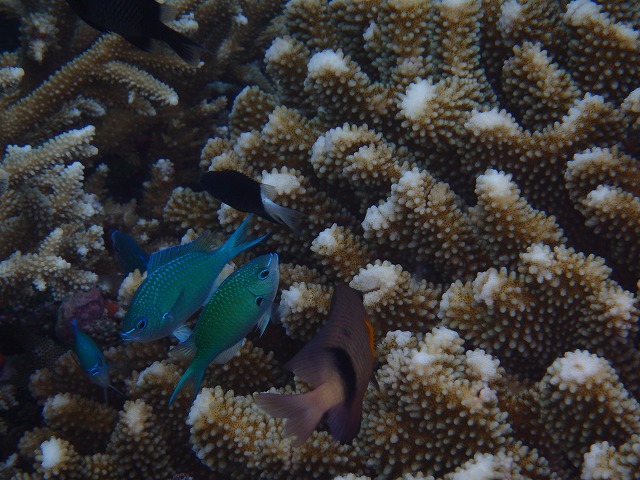 浅瀬のサンゴの周りにはスズメダイ各種♪