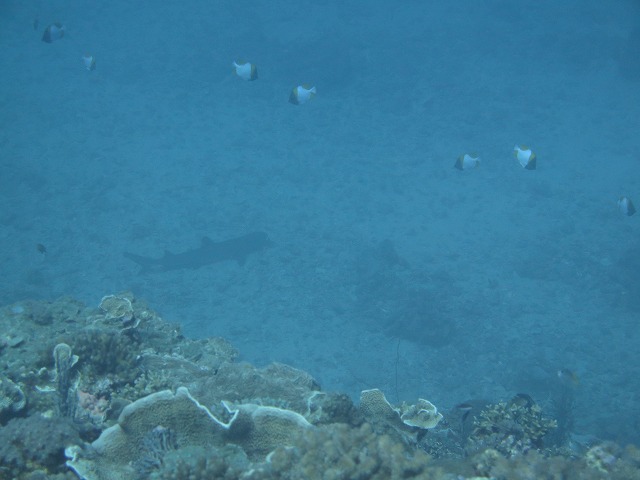 潮が当たる根の先にはたーくさんのカスミチョウチョウウオやグルクンが集まり、その下の水底にはホワイトチップもお昼寝中でした☆