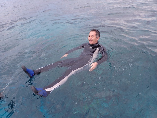 さて、説明が終わりましたらウェットスーツで海に浮かんで頂きました。