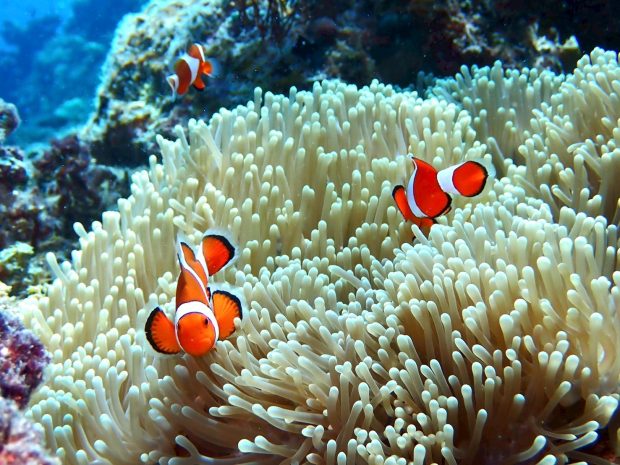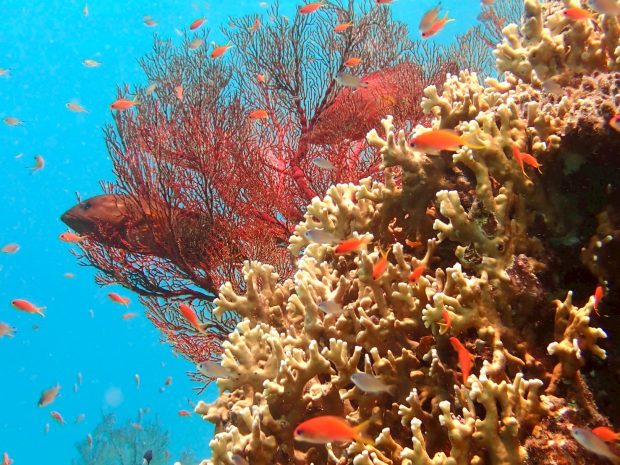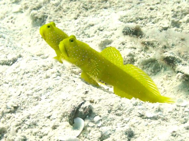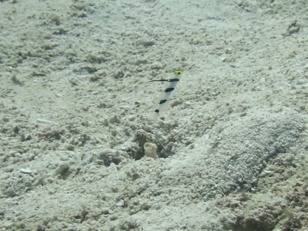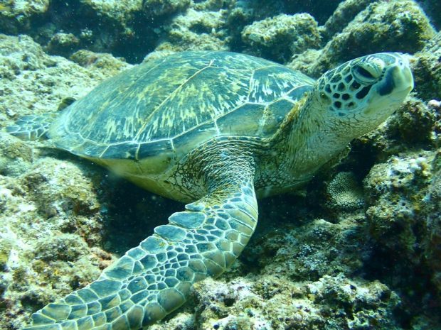 テリトリーを死守したいゴマモンガラVSその辺でゆっくりしたいアオウミガメ。