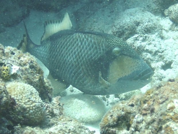 岩陰で休もうとするカメを追い出したいゴマモンガラ。