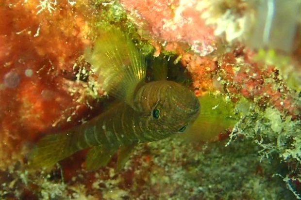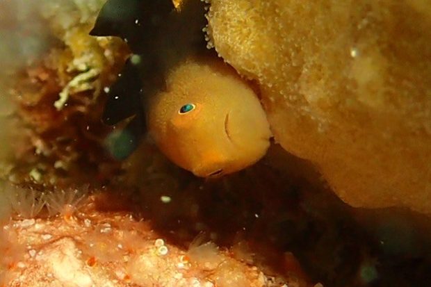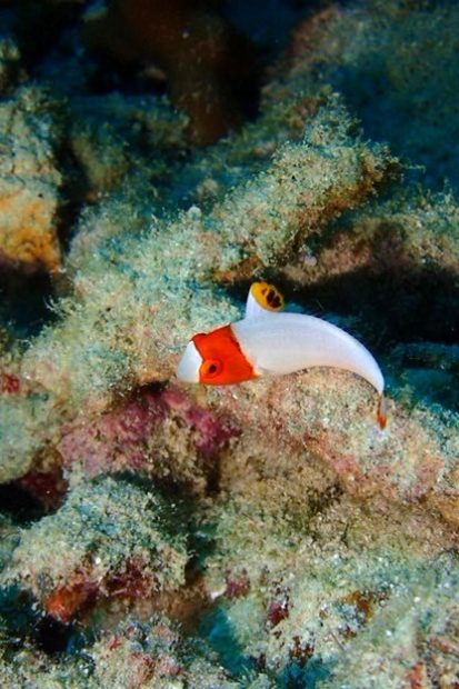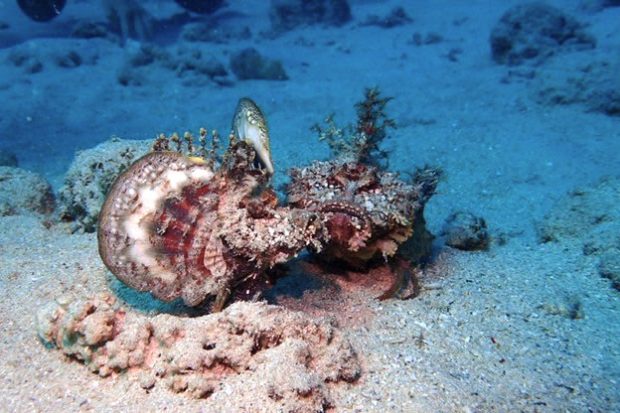 自分の膝下を見ると、ヒレを全開にした “ヒメオニオコゼ” が威嚇していました。